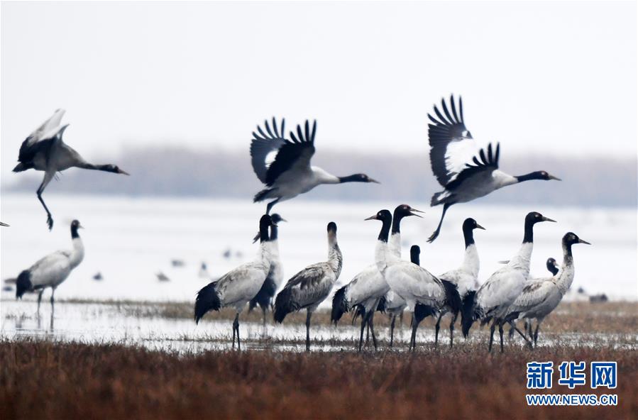 在草海國家級自然保護區(qū)越冬的黑頸鶴(2019年12月11日攝)。新華社記者楊文斌攝