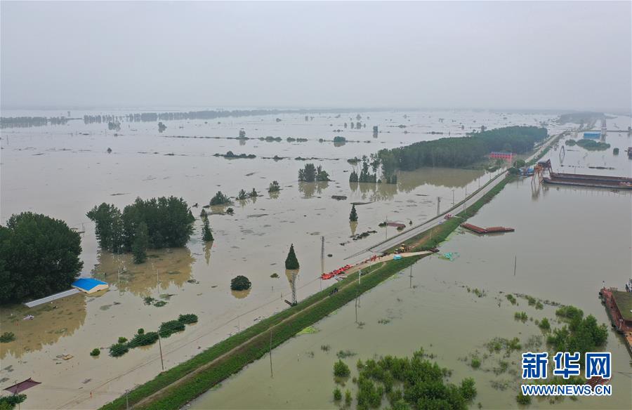 這是7月21日拍攝的被淹的南京市高淳區(qū)陽江鎮(zhèn)勝利圩(畫面左側)(無人機照片)。新華社記者季春鵬攝