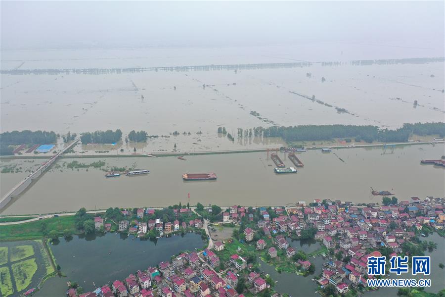 7月21日拍攝的水陽江對岸被淹的南京市高淳區(qū)陽江鎮(zhèn)勝利圩(無人機(jī)照片)。新華社記者季春鵬攝