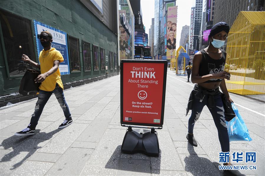 7月23日,在美國紐約時報廣場,人們從保持社交距離的提示牌旁走過。美國約翰斯·霍普金斯大學(xué)23日發(fā)布的新冠疫情最新統(tǒng)計數(shù)據(jù)顯示,美國累計確診病例超過400萬例。數(shù)據(jù)顯示,截至美國東部時間23日15時34分(北京時間24日3時34分),美國累計確診病例4007859例,累計死亡病例143846例。新華社記者王迎攝