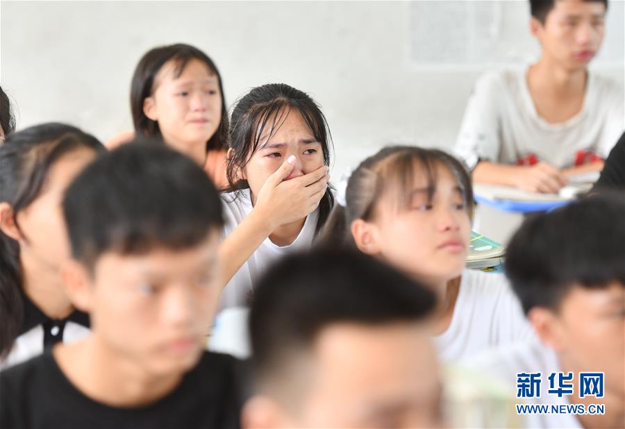 在融水苗族自治縣丹江中學1708班舉辦的送別班會上,一名學生聽到支教老師溫昌浩的臨別寄語時流淚(7月23日攝)。新華社記者黃孝邦攝