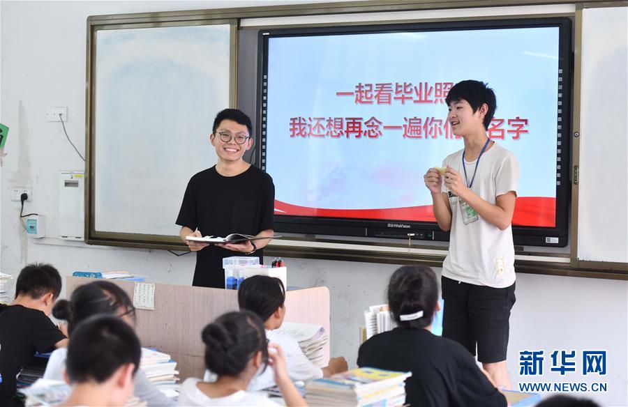 在融水苗族自治縣民族中學1818班舉辦的送別班會上,支教老師高潔給同學們上最后一節(jié)英語課(7月23日攝)。新華社記者黃孝邦攝