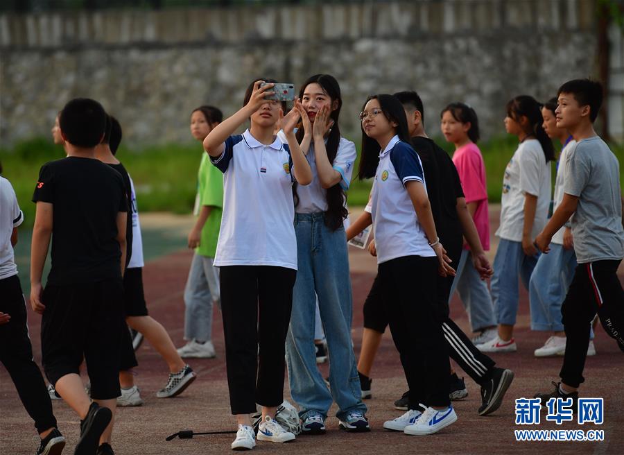 在融水苗族自治縣思源實(shí)驗(yàn)學(xué)校舉辦的支教團(tuán)送別晚會(huì)上,支教老師林洋港(中)和同學(xué)們合影留念(7月22日攝)。新華社記者黃孝邦攝