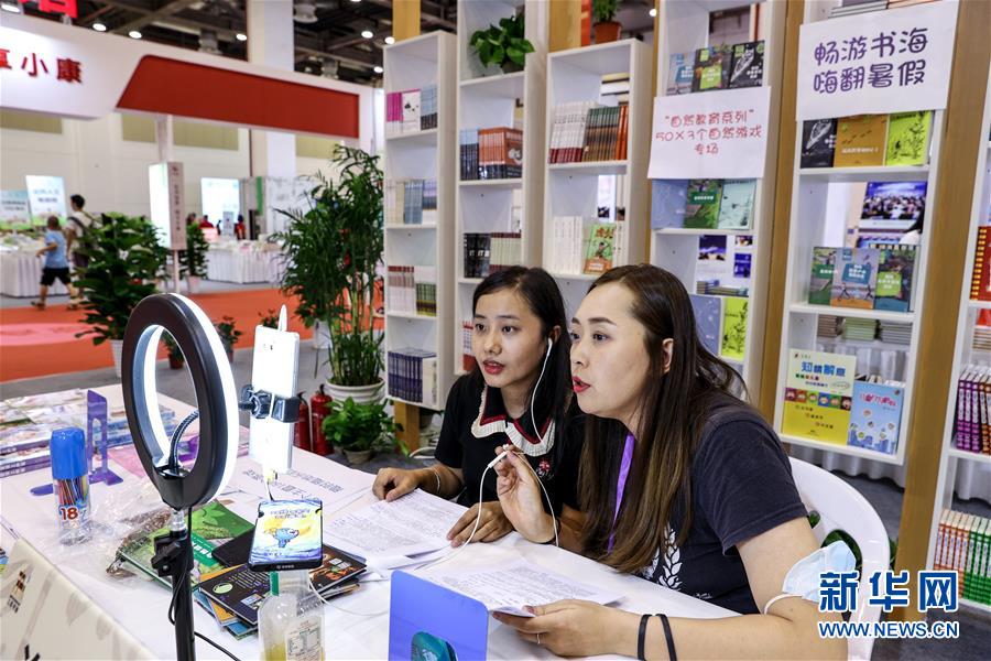 7月23日,兩位參展工作人員在網(wǎng)上直播介紹圖書(shū)。當(dāng)日,第十屆江蘇書(shū)展在江蘇蘇州開(kāi)幕,400多家出版發(fā)行單位參展,吸引眾多讀者選購(gòu)圖書(shū)。新華社記者楊磊攝