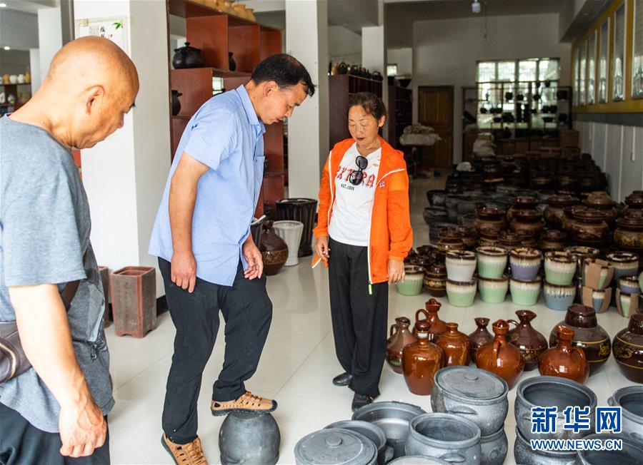 母先才(中)向游客展示陶器制品(6月16日攝)。新華社記者 陶亮 攝