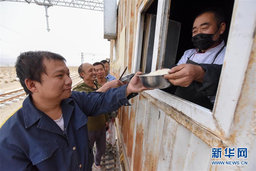 在索爾庫(kù)里宿營(yíng)地,中鐵一局的施工人員在“白皮列車(chē)”內(nèi)吃午飯(7月19日攝)。新華社記者 丁磊 攝