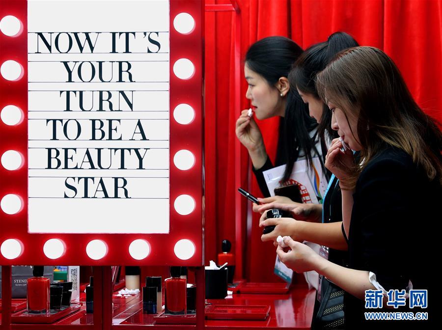 在第二屆進(jìn)博會品質(zhì)生活展區(qū),觀眾在歐萊雅旗下品牌彩妝展臺試用口紅(2019年11月6日攝)新華社記者 劉穎 攝