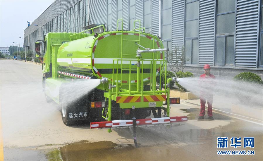 7月27日,河北景縣開發(fā)區(qū)一家新能源汽車制造公司工人在對(duì)增程式新能源灑水車進(jìn)行性能校驗(yàn)。新華社記者 李曉果 攝