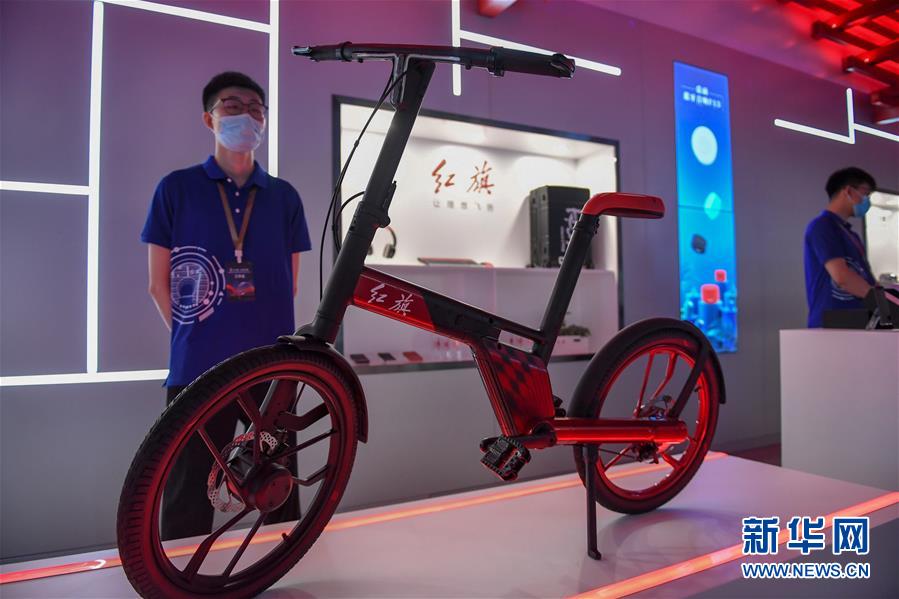 這是在紅旗創(chuàng)新大廈內(nèi)展出的紅旗電動自行車(7月28日攝)。