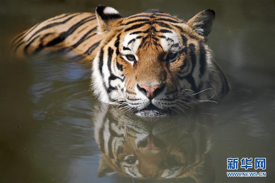 7月28日,在橫道河子?xùn)|北虎林園,東北虎在水中納涼。時(shí)值盛夏,位于黑龍江省海林市的橫道河子?xùn)|北虎林園的東北虎活動(dòng)量減少,以不同方式消夏納涼。新華社記者王建威攝