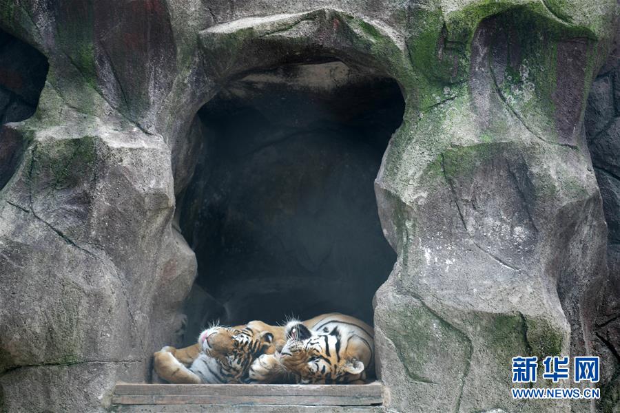 在橫道河子東北虎林園,東北虎在休息(7月27日攝)。時值盛夏,位于黑龍江省海林市的橫道河子東北虎林園的東北虎活動量減少,以不同方式消夏納涼。新華社記者王建威攝