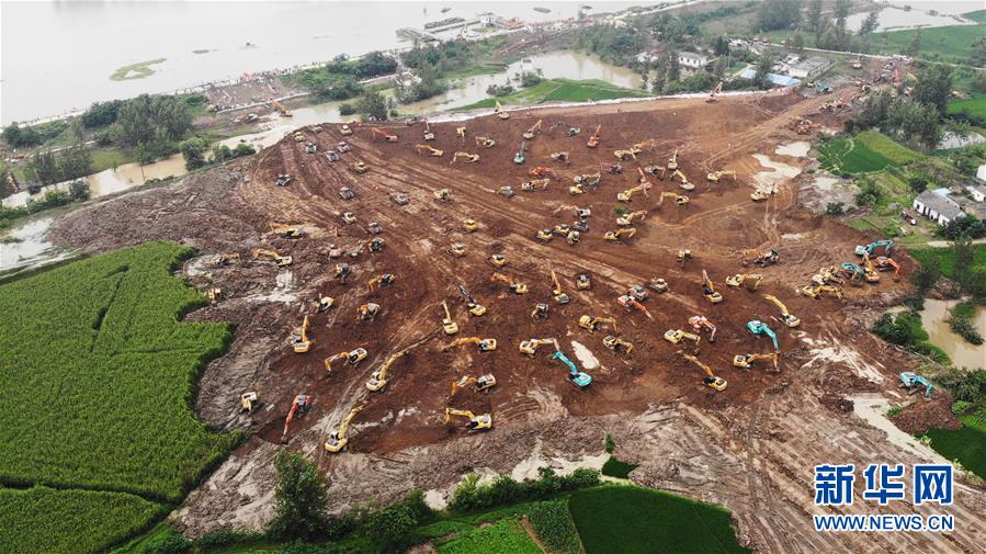 7月28日,在姜唐湖蓄洪區(qū)戴家湖一處涵閘險(xiǎn)情處置現(xiàn)場(chǎng),人們操作機(jī)械設(shè)備在搶筑臨時(shí)圩堤(無(wú)人機(jī)照片)。新華社記者黃博涵攝