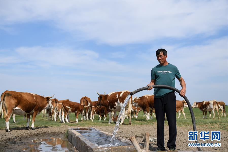 呼格吉勒在自家的牧場(chǎng)飲牛(7月23日攝)。