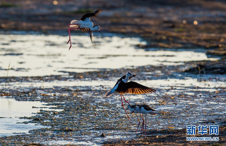 7月28日,在鄂爾多斯?jié)竦靥伊R—阿拉善灣海子,兩只長(zhǎng)腳鷸在爭(zhēng)斗。鄂爾多斯?jié)竦匚挥趲?kù)布齊沙漠、毛烏素沙地接壤地帶,2002年被列入國(guó)際重要濕地名錄。從2006年開(kāi)始,由于濕地湖面萎縮、湖心島消失,在此筑巢繁殖的世界瀕危物種遺鷗幾近消失。近年來(lái),當(dāng)?shù)夭扇《喾N治理措施,濕地生態(tài)環(huán)境逐步好轉(zhuǎn)。2019年起,濕地內(nèi)的桃力廟—阿拉善灣海子迎來(lái)遺鷗大規(guī)模“回歸”。如今,40多種鳥(niǎo)類在此棲息,鄂爾多斯?jié)竦刂匦鲁蔀轼B(niǎo)類的樂(lè)園。新華社記者連振攝