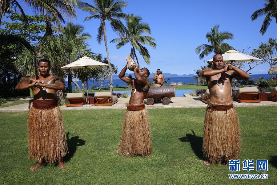 7月21日,在斐濟(jì)首都蘇瓦附近的納努庫奧博格海邊度假村,身穿草裙的斐濟(jì)“武士”為游客表演節(jié)目。新華社記者張永興攝