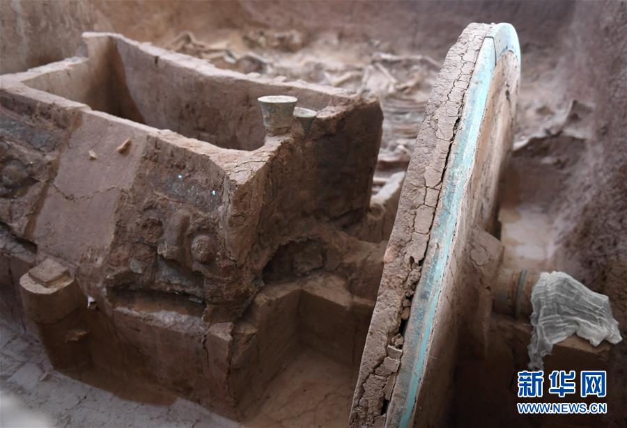 這是7月30日在陜西省考古研究院涇渭基地拍攝的西周晚期青銅輪牙馬車車廂部分。新華社記者李一博攝
