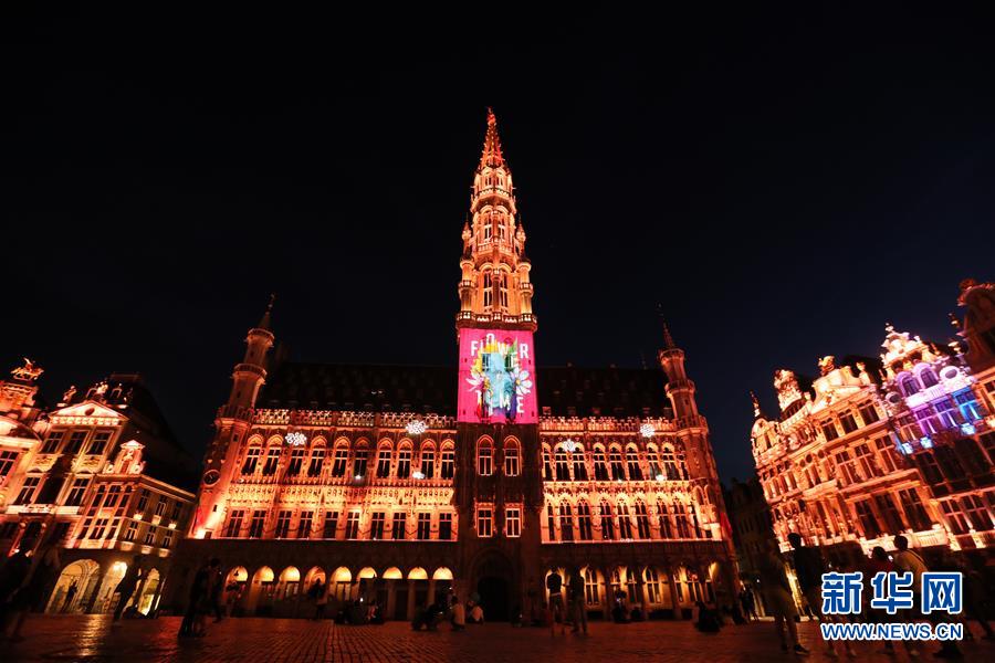 7月29日,人們在比利時布魯塞爾大廣場欣賞聲光秀,市政廳外墻上投射出“鮮花時光”的字樣。7月29日,比利時布魯塞爾大廣場舉行大型聲光秀。藝術(shù)家在市政廳等歷史建筑上投影文字和圖案,紀(jì)念這個夏天受新冠疫情影響而不能如期舉辦的文化活動。新華社記者鄭煥松攝