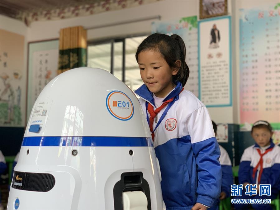 拉孜鄉(xiāng)中心小學(xué)學(xué)生在與智能機(jī)器人對(duì)話(huà)(7月29日攝)。新華社記者洛卓嘉措攝