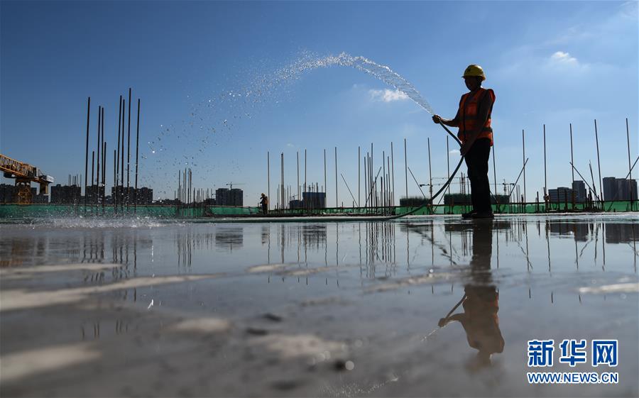8月3日,工人在長江文創(chuàng)產(chǎn)業(yè)園項(xiàng)目工地工作平面澆水降溫。進(jìn)入8月,武漢迎來持續(xù)高溫天氣。在湖北廣電傳媒基地工程的工地上,中建三局總承包公司1500多名工人持續(xù)奮戰(zhàn),力保工程進(jìn)度。該工程是我國中部地區(qū)首個(gè)國家級(jí)廣播影視媒體基地,由湖北廣電傳媒大廈項(xiàng)目、長江文創(chuàng)產(chǎn)業(yè)園項(xiàng)目、廣電生活配套項(xiàng)目三大板塊組成,總建設(shè)規(guī)模130萬平方米。自今年3月25日獲批正式復(fù)工以來,承建方克服困難,把因疫情影響耽誤的工期趕了回來,預(yù)計(jì)將按原計(jì)劃完成建設(shè)任務(wù)。新華社記者程敏攝