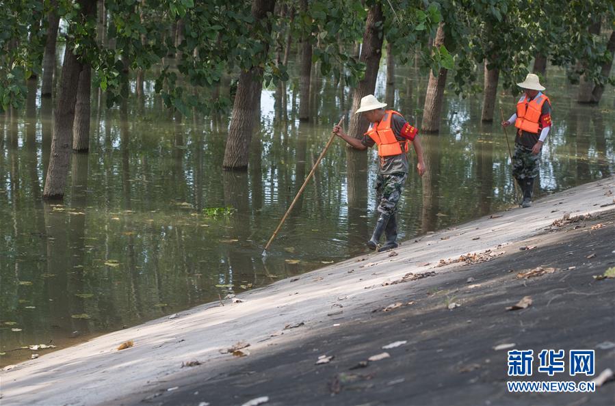 8月5日,夏德勤(左)與同事在長江武金堤上巡查。新華社記者肖藝九攝
