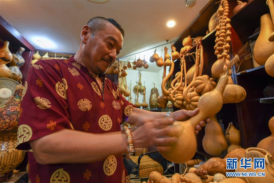 8月5日,侯景偉挑選適合創(chuàng)作的葫蘆。今年55歲的吉林四平人侯景偉自幼與家人學(xué)習(xí)雕刻、烙畫藝術(shù)。經(jīng)過多年潛心研究,他將浮雕和烙畫工藝相結(jié)合,通過拋光、起稿、雕刻、烙燙、套色等十余道工藝,制作展現(xiàn)傳統(tǒng)文化、民俗故事的葫蘆工藝品。2020年,侯景偉被評為四平市非物質(zhì)文化遺產(chǎn)項(xiàng)目侯氏葫蘆雕刻烙畫代表性傳承人。他說:“希望有更多人加入到非遺傳承隊(duì)伍中,讓小葫蘆‘講’出更多民俗故事?!毙氯A社記者張楠攝