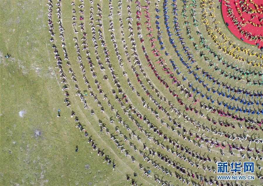 西藏首屆弦子舞展演現(xiàn)場(8月7日攝,無人機照片)。當日,西藏首屆弦子舞展演在昌都市芒康縣舉行。眾多演員同臺獻藝,表演國家級非物質(zhì)文化遺產(chǎn)弦子舞,吸引西藏各地的群眾前來觀看。新華社記者孫非攝
