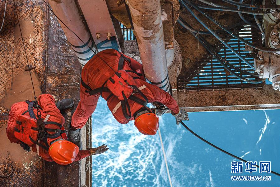 7月27日,工人在位于南海北部海域的勘探三號(hào)鉆井平臺(tái)上作業(yè)。新華社記者蒲曉旭攝