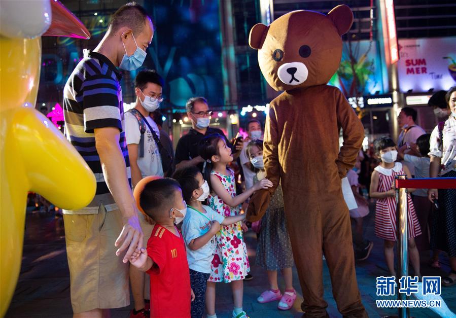 8月8日晚,小朋友在望京小街商業(yè)街與人偶互動。新華社記者 陳鐘昊 攝