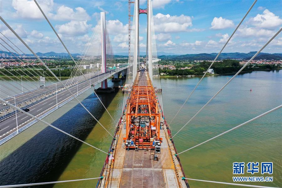 8月9日拍攝的廣州南沙港鐵路跨西江特大斜拉橋最后一塊鋼箱梁吊裝施工現(xiàn)場(chǎng)(無人機(jī)照片)。當(dāng)日,中鐵十一局承建的粵港澳大灣區(qū)基礎(chǔ)設(shè)施“硬聯(lián)通”重點(diǎn)工程——廣州南沙港鐵路跨西江特大斜拉橋完成最后一塊鋼箱梁吊裝作業(yè),大橋即將合龍。該橋位于廣東佛山市和江門市交界處,全長1117.5米。新華社記者劉大偉攝。