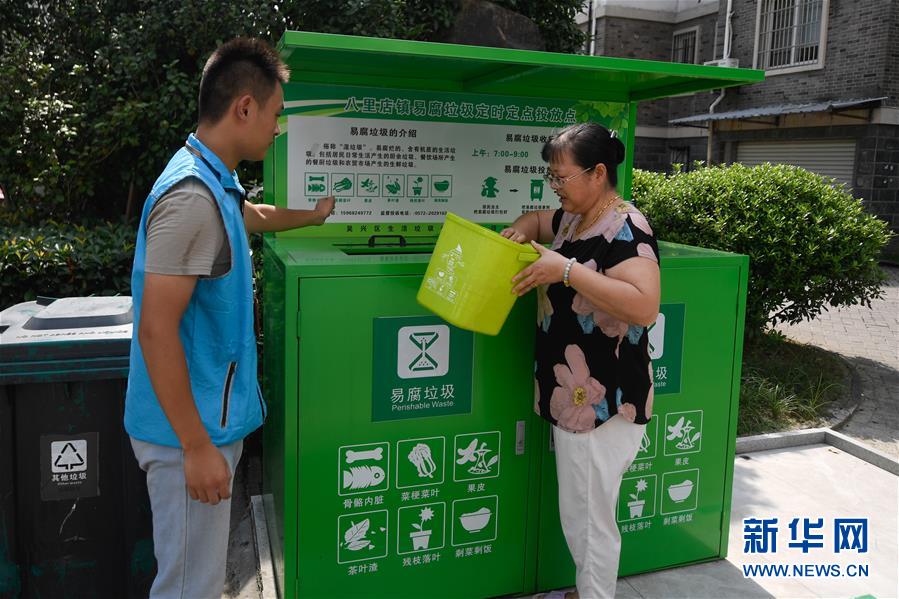 8月9日,湖州市吳興區(qū)八里店鎮(zhèn)百合苑居民(右)投放易腐垃圾。近年來(lái),浙江省通過(guò)創(chuàng)新宣傳教育,多措并舉促進(jìn)垃圾分類投放、收運(yùn)及處置的良性循環(huán),引領(lǐng)垃圾分類成為城鄉(xiāng)居民的生活新風(fēng)尚。新華社記者黃宗治攝。