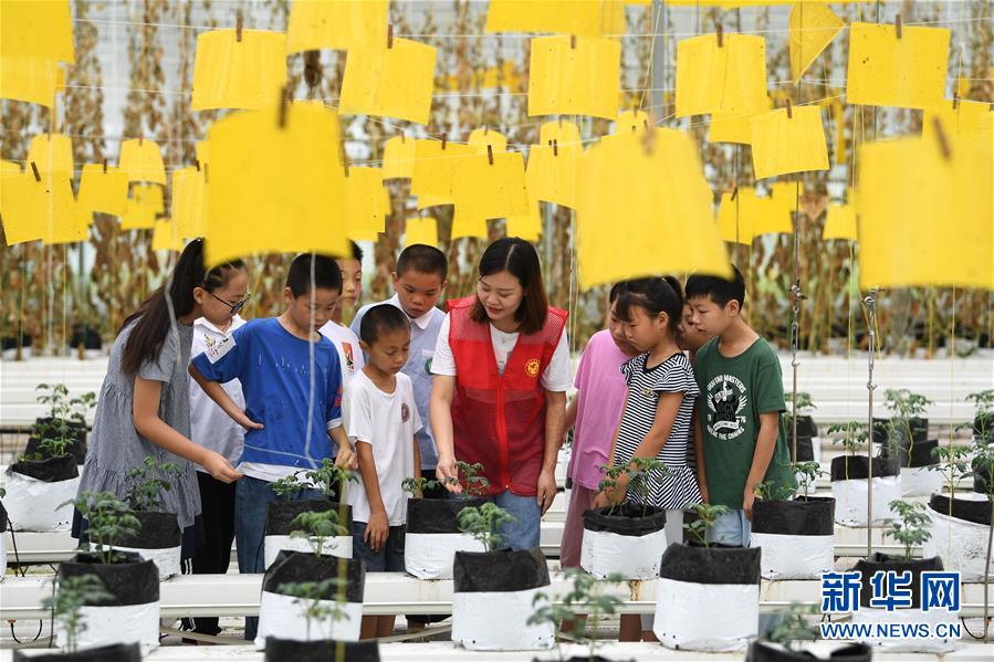 8月9日,在花崗鎮(zhèn)現(xiàn)代農業(yè)示范區(qū)一家蔬菜種植企業(yè)內,志愿者向小朋友介紹蔬菜種植模式。當日,安徽省肥西縣花崗鎮(zhèn)開展暑期“親近自然體驗田園”活動,邀請轄區(qū)兒童參觀花崗鎮(zhèn)現(xiàn)代農業(yè)示范區(qū),感受現(xiàn)代農業(yè)的魅力。新華社記者劉軍喜攝。