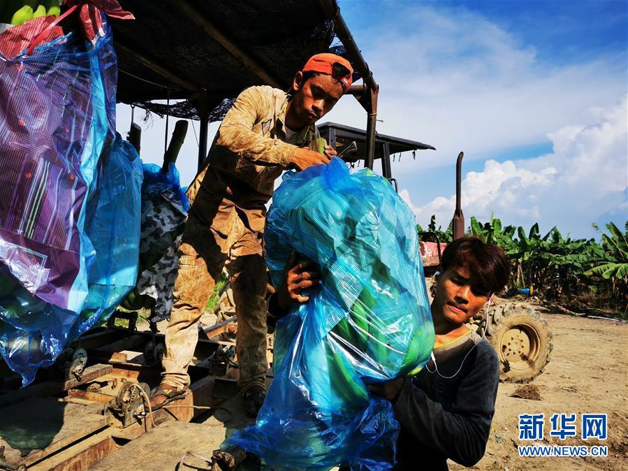 7月16日,在柬埔寨桔井省的柬埔寨—中國熱帶生態(tài)農(nóng)業(yè)合作示范區(qū)內(nèi),工人搬運剛剛收獲的香蕉(手機拍攝)。新華社記者毛鵬飛攝。