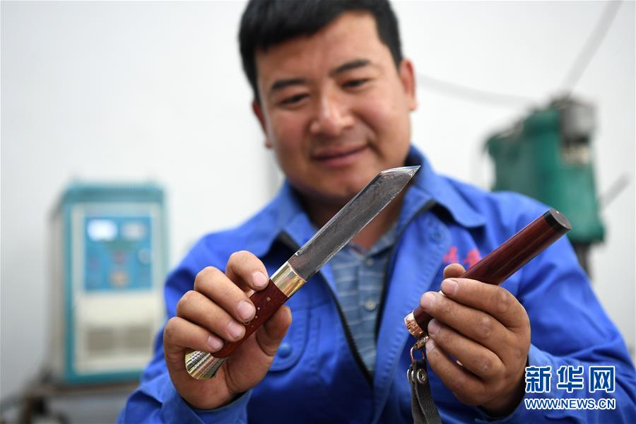 8月10日,在甘肅省臨夏回族自治州積石山縣大河家鎮(zhèn),國家級非物質(zhì)文化遺產(chǎn)代表性項目保安族腰刀鍛制技藝傳承人馬尕主麻在查看一把鍛制好的保安腰刀。新華社記者陳斌攝。
