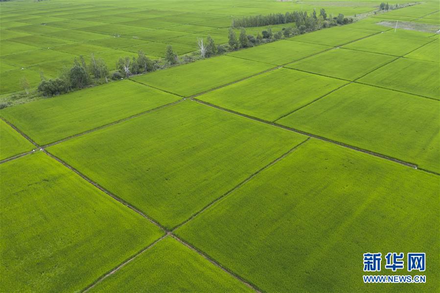8月11日在撫遠(yuǎn)市拍攝的稻田(無人機(jī)照片)。時(shí)下,“華夏東極”黑龍江省撫遠(yuǎn)市的水稻長(zhǎng)勢(shì)良好,蒼翠的稻田一望無際,猶如綠毯鋪在大地上。新華社記者謝劍飛攝。