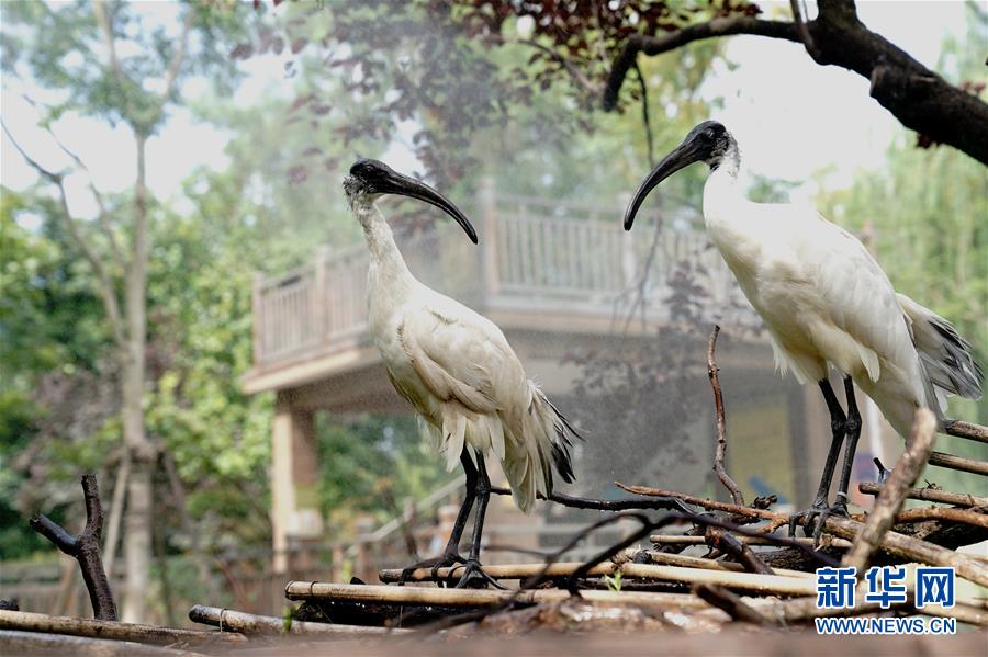 8月11日,上海動物園的兩只白鹮在享受噴淋降溫。當(dāng)日,上海最高溫度達到35攝氏度,上海動物園開啟園內(nèi)安裝的各種噴淋裝置,讓動物們防暑降溫,樂享清涼。新華社記者張建松攝