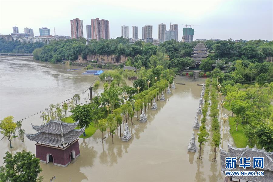 8月12日,重慶市潼南區(qū)大佛寺景區(qū),涪江洪水淹沒景區(qū)廣場(無人機照片)。受強降雨影響,涪江潼南段迎來過境洪水。截至12日下午5時,涪江潼南城區(qū)段最高水位238.5米,超警戒水位0.5米,低于保證水位(240米)。此次過境洪水導(dǎo)致潼南區(qū)部分場鎮(zhèn)低洼地段局部進(jìn)水,約2700畝農(nóng)作物不同程度受災(zāi)。新華社記者 黃偉 攝