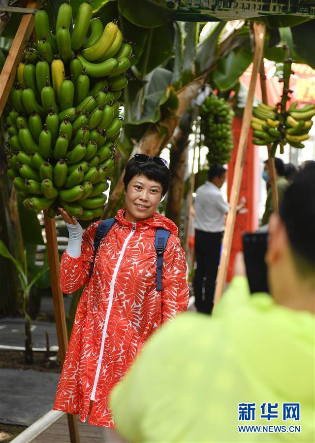 在吉林省永吉縣萬昌鎮(zhèn)宇豐紅果木瓜產(chǎn)業(yè)園,游客與大棚內(nèi)的香蕉合影留念(8月12日攝)。新華社記者 許暢 攝