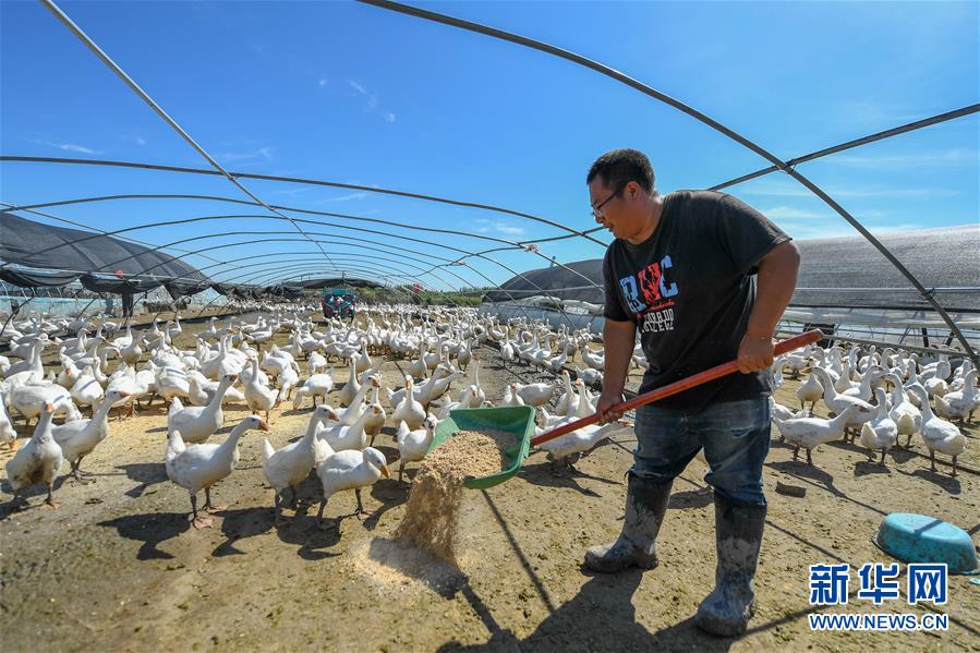 8月12日,在鎮(zhèn)賚縣黑魚泡鎮(zhèn)岔臺(tái)村,村民王木堯在投喂鵝飼料。新華社記者 張楠 攝