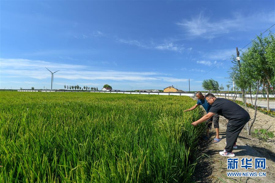 8月12日,在鎮(zhèn)賚縣黑魚泡鎮(zhèn)岔臺(tái)村,村民曲海波(左)和駐村第一書記姜宏寅在查看水稻長(zhǎng)勢(shì)。新華社記者 張楠 攝