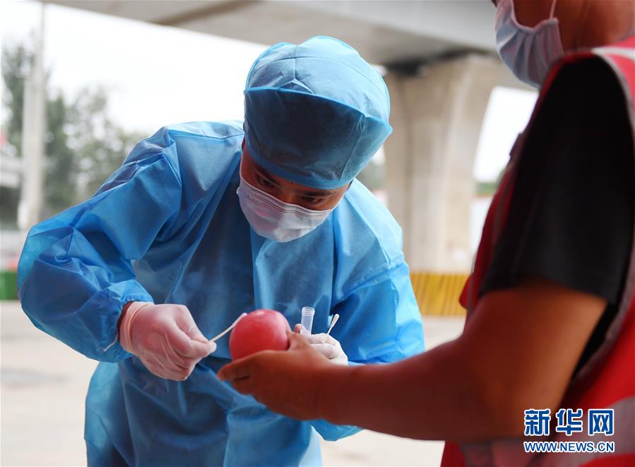 工作人員在新發(fā)地批發(fā)市場(chǎng)周轉(zhuǎn)新區(qū)對(duì)進(jìn)場(chǎng)車(chē)輛進(jìn)行取樣(8月6日攝)。 新華社記者 張晨霖 攝