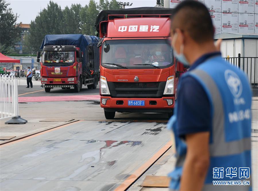 進(jìn)場(chǎng)車(chē)輛進(jìn)入新發(fā)地批發(fā)市場(chǎng)周轉(zhuǎn)新區(qū)(8月6日攝)。 新華社記者 張晨霖 攝