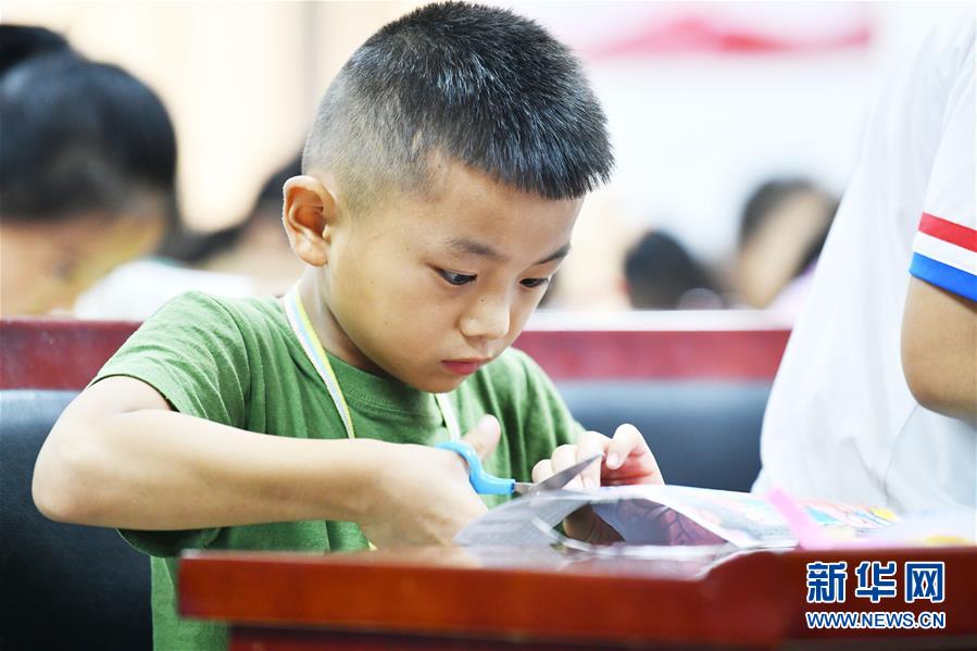 8月13日,貴州省思南縣雙塘街道麗景社區(qū)易地扶貧搬遷安置點(diǎn)的孩子在學(xué)習(xí)剪紙。新華社記者楊文斌攝