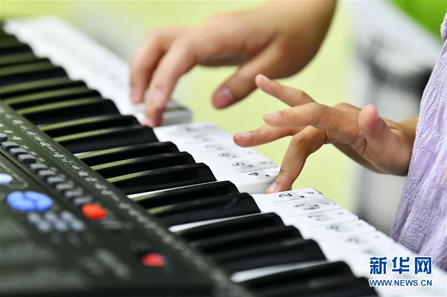 8月13日,在貴州省思南縣雙塘街道麗景社區(qū)易地扶貧搬遷安置點(diǎn),志愿者在指導(dǎo)孩子學(xué)彈電子琴。新華社記者楊文斌攝