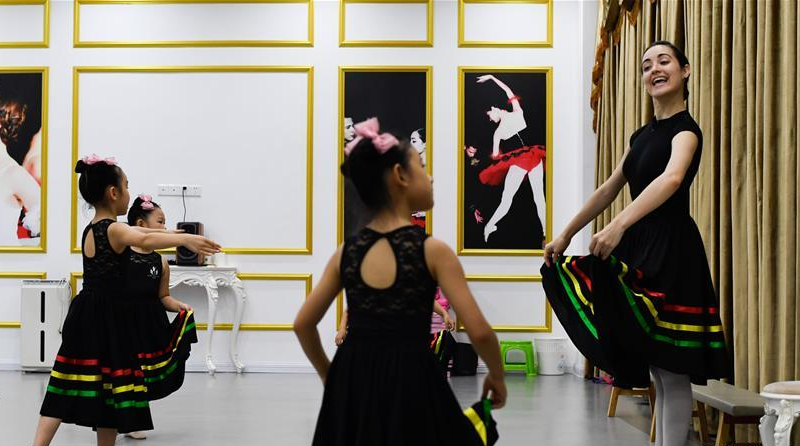 在三亞吉普西芭蕾學(xué)校鴻洲校區(qū),老師在指導(dǎo)學(xué)員練習(xí)芭蕾舞(8月4日攝)。