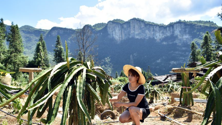 8月3日,在碗米坡鎮(zhèn)首八峒村,種植基地負(fù)責(zé)人易潤菊采摘成熟的火龍果。