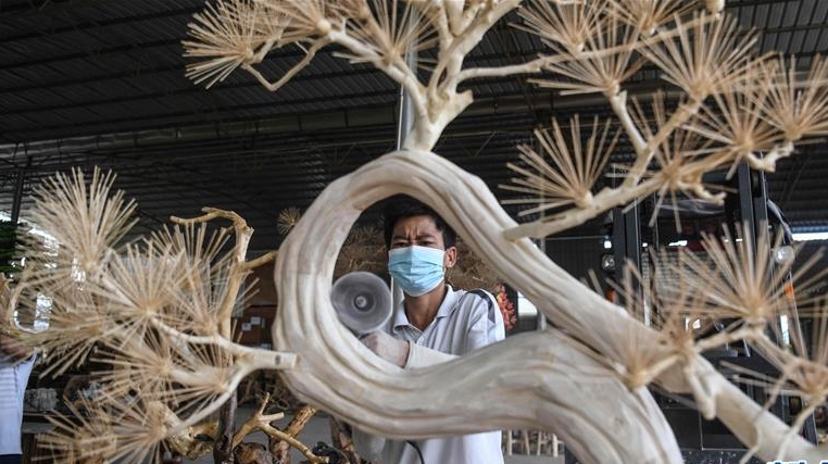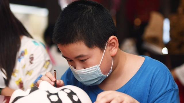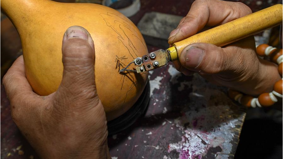 8月5日,侯景偉在葫蘆上進(jìn)行創(chuàng)作。經(jīng)過(guò)多年潛心研究,他將浮雕和烙畫(huà)工藝相結(jié)合,通過(guò)拋光、起稿、雕刻、烙燙、套色等十余道工藝,制作展現(xiàn)傳統(tǒng)文化、民俗故事的葫蘆工藝品。