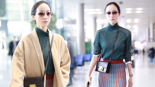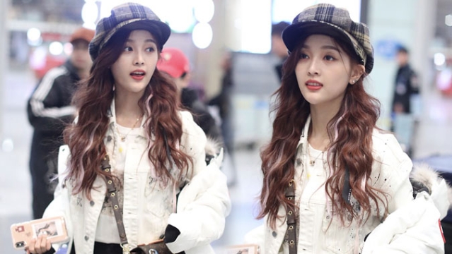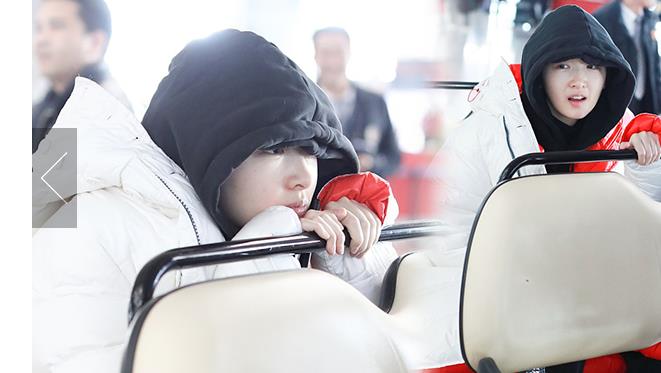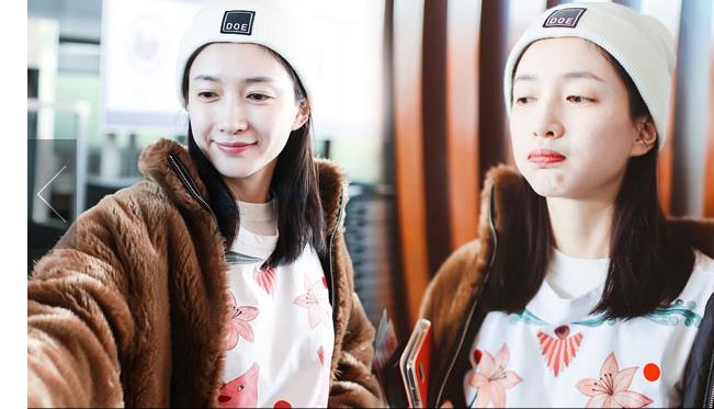 1月23日,北京,周冬雨現(xiàn)身機(jī)場。她用黑色連衣帽罩頭襯托巴掌臉,把下巴擱在行李車推桿上的雙手上呆萌可愛 。