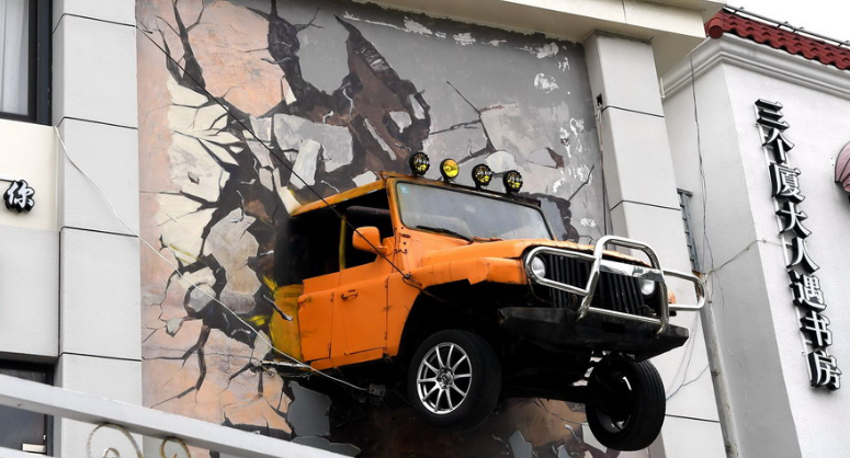 2018年11月13日,在廈門市區(qū)環(huán)島路上,一輛裝飾在建筑墻面上的汽車,結合3D圖案讓人感覺汽車“破”墻而出,創(chuàng)意十足。