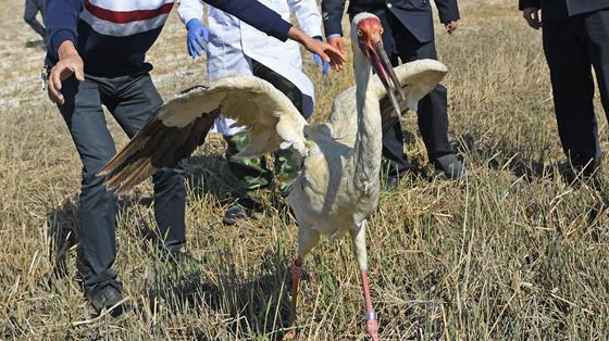 當(dāng)日,在吉林省莫莫格國家級自然保護(hù)區(qū),江西省野生動植物救護(hù)繁育中心工作人員將一只在江西鄱陽湖區(qū)“落單”的小白鶴放飛野外。