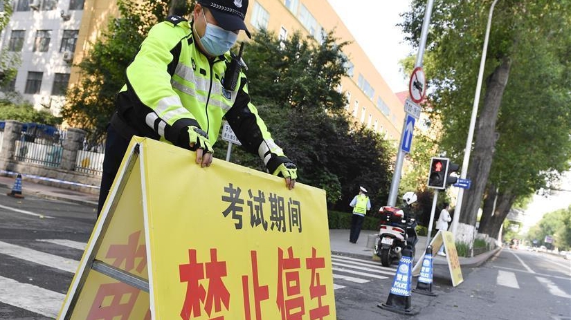 7月7日,在吉林省長春市的東北師范大學(xué)附屬中學(xué)考點(diǎn)外,執(zhí)勤交警在道路上架設(shè)提示牌。